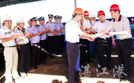 在集团公司董事长郑日强、工会主席沈玉琼的陪同下,廖汝捷一行参观了我港25万吨级铁矿石码头和30万吨级油码头,并前往霞山港区大型散货码头和宝满集装箱码头施工工地,慰问在高温下坚持施工的一线员工。