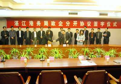 湛江港务局局长梁建伟分别与湛江市港务管理局、市环保局、市卫生局领导签订移交接收协议书。从4月1日起,湛江港基本建设工程质量监督站、卫生防站、环境监测站正式移交属地政府管理。