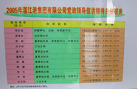 在信访接待室,“集团党政领导信访接待日安排表”被张贴上公示栏内,集团总裁、副董事长、党委副书记、纪委书记、副总裁、工会主席等8人榜上有名,名单已经安排到今年年底。