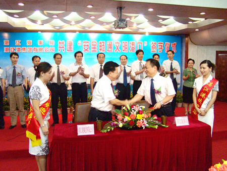 2005年7月16日下午,湛江海事局、湛江港集团公司举行共建"安全文明港口"签字仪式。这标志着双方合作伙伴关系更加紧密,为营造我港良好的通航及作业服务环境奠定了坚实的基础。交通部海事局党委书记梁晓安,广东海事局党委书记梁建伟,市委常委徐志农、副市长赵志辉,湛江海事局局长钟国青、副局长申春生,集团公司董事长郑日强、总裁张翼、副总裁康广全、工会主席沈玉琼等出席仪式。