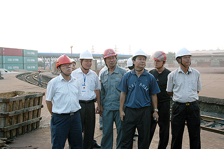 集团董事长郑日强(左一)、副总裁赖镰(右三)及有关部室领导亲临重载调试现场,协调指导工作。