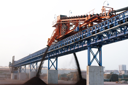 铁矿石源源不断地从卸料小车出口倾泻而出。