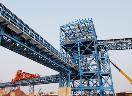 2005年10月20日下午16时多,笔者赶到水转水工艺系统工程施工现场,技术人员正在进行最后的调试,紧张忙碌的身影来回穿梭。17时08分,随着总指挥一声令下,BC17、18、16#带式输送机随即启动,约10分钟,从“橡树”轮卸下的铁矿石经过皮带机输送,转换房的转换,源源不断地从两台卸料小车四个出口倾泻而出,堆场一会儿就出现一座座“小矿山”,这意味着该工艺系统重载调试取得成功。