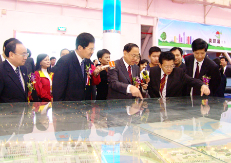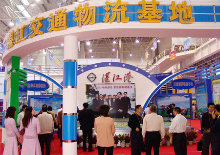 湛江工博会于2005年11月25日开幕,我港利用“交通物流基地”展位以图片形式展示了“三大工程”和筹建的宝满集装箱码头一期工程。上图为广东省副省长游宁丰等领导在市委书记徐少华、代市长陈耀光陪同下参观我港“交通物流基地”展位,集团董事长郑日强在临港工业园模型前向省市领导详细介绍我港发展规划。下图为我港“交通物流基地”展位(文悦才/文 林文宪/图)