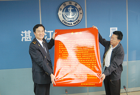 郑日强董事长(图右)代表集团公司给湛江海事局送上感谢信