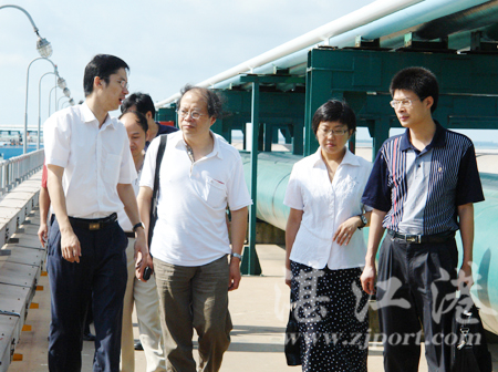 2006年9月8日,国务院研究室社会发展司司长朱幼棣带领南方沿海港口调研组莅临我港指导工作。张翼总裁陪同参观考察了30万吨级油码头和20万吨级铁矿石码头,并介绍我港建设发展、“十一五”规划有关情况。调研组在调研时要求我港站在国家发展战略目标的高度,做好相关项目规划工作。(邓敏 摄影报道)